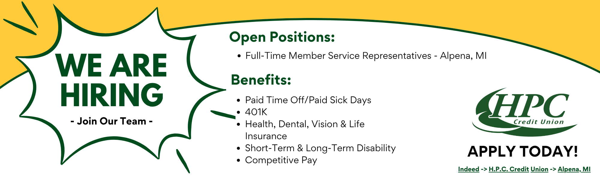 HPC Credit Union’s main office drive-thru on Chisholm St. will be closed beginning Friday, September 5, 2025, for remodeling construction. During this period, please use our Ripley office drive-thru, located at 300 S. Ripley Blvd., Alpena, MI 49707. We will continue to serve our members inside the main office, and we welcome you to visit us inside! If you have any questions, please give us a call or stop into one of our offices. (989) 354-4698 Thank you!